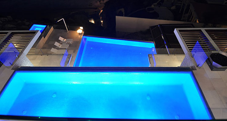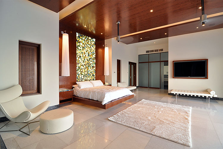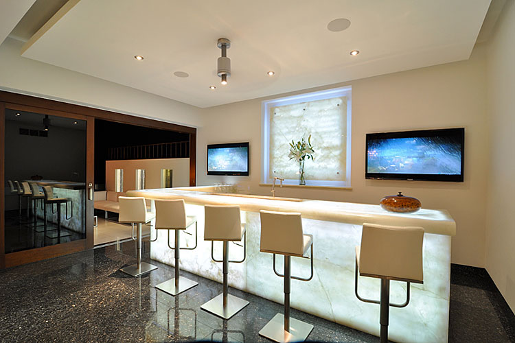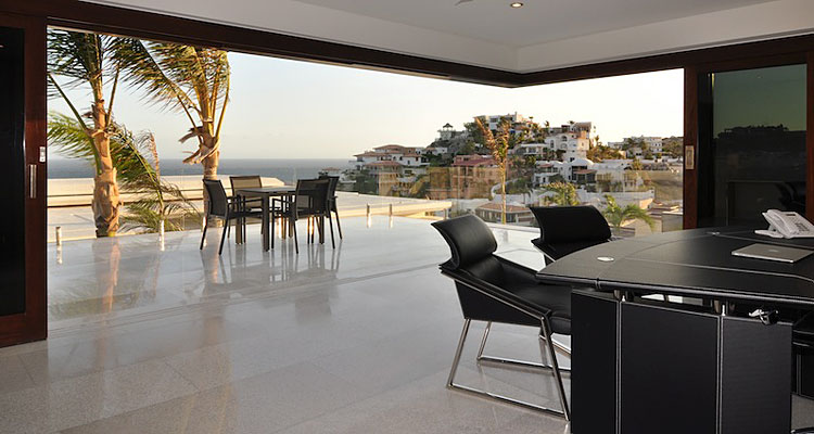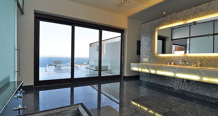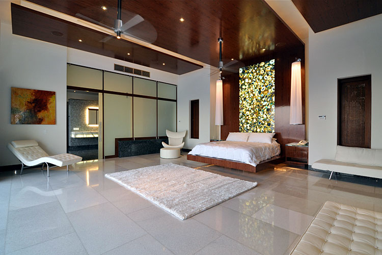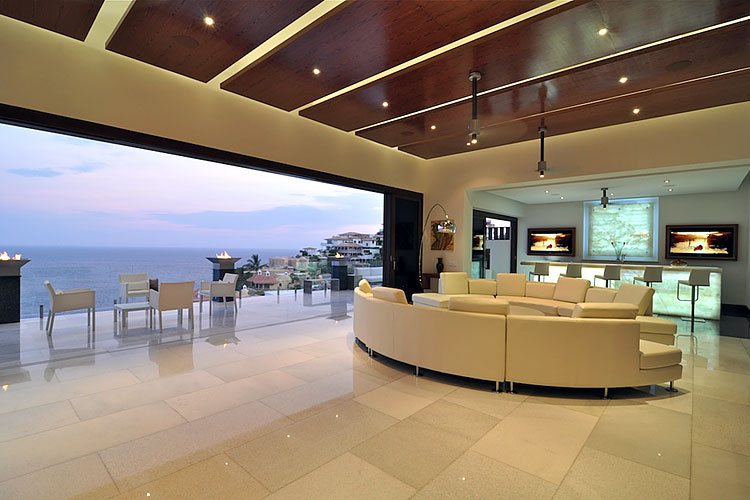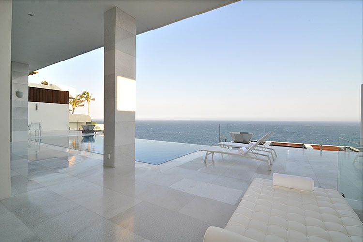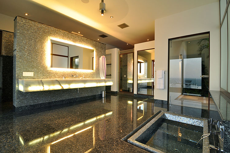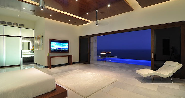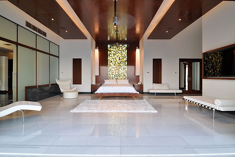 The master suite has no peers. Brazilian rosewood floating bed and headboard centered with backlit African Agate above a floor of crystal white Tibeten granite, the suite is an entire level of the home. In addition to its own 30 foot infinity pool and terrace, the master suite also features two full his and her bathrooms complete with soaking tubs, rain showers and onyx vanities with hidden TV’s behind the mirrors. The architect explains that, “People are attracted to Cabo not only for the weather and the ocean, but a chance to enjoy relaxing in a sublime environment. I designed this home and especially the master suite to fulfill that romantic desire.”